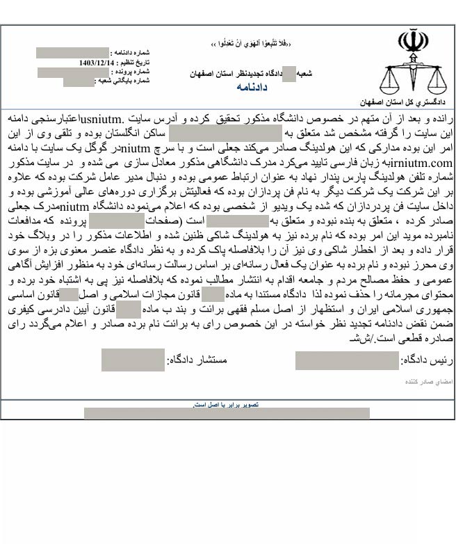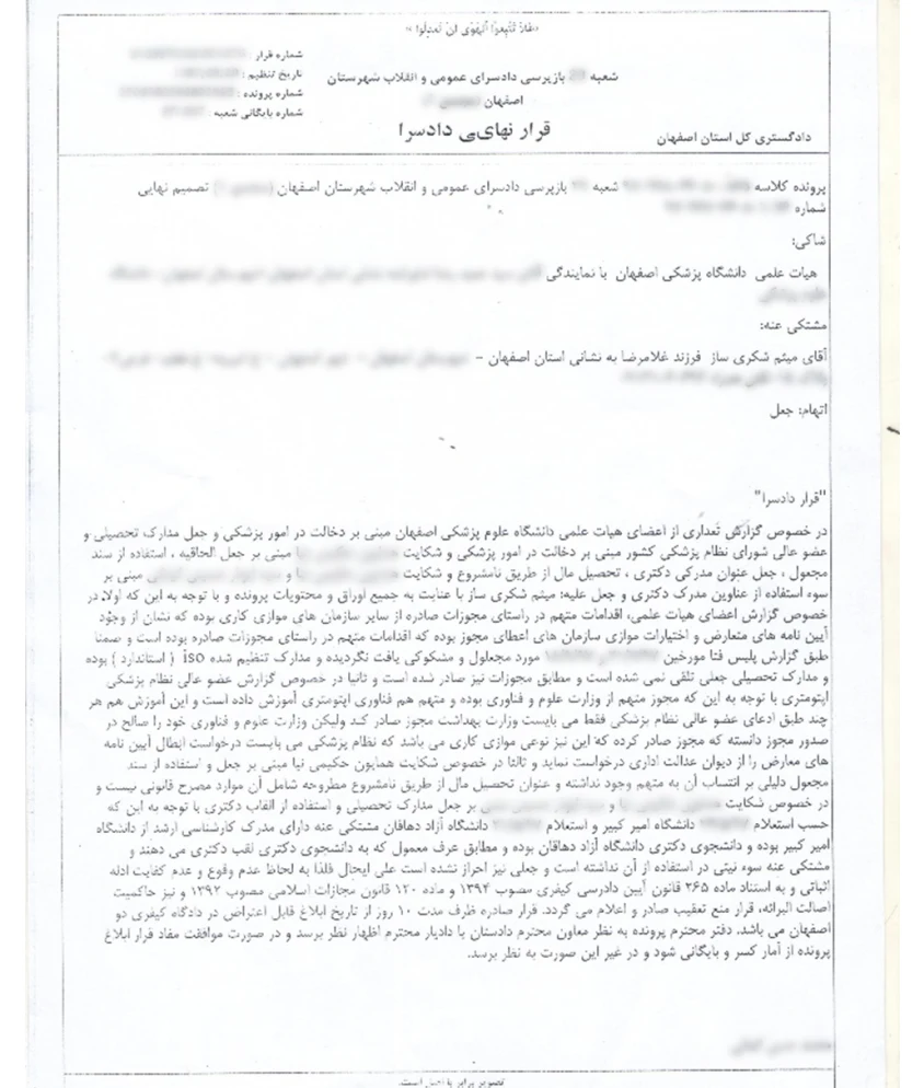 رای دادگاه رسیدگی به پرونده اعطای مدارک جعلی توسط سلطان جعل