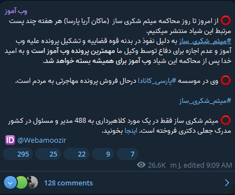به عنوان مثال علی مختاری در ویدیویی اشاره می کند که کانال تلگرامی وب آموز مطالبی را علیه شرکت مهاجرتی پارسی کانادا منتشر کرده است. همچنین در قسمت description این ویدیوی یوتیوبی صراحتا به کاربران توصیه می شود که برای آشنایی با دکتر آریا پارسا به وب سایت یا کانال تلگرامی وب آموز مراجعه کنند (تصویر زیر را مشاهده نمایید)