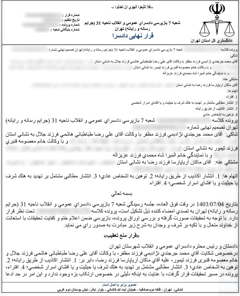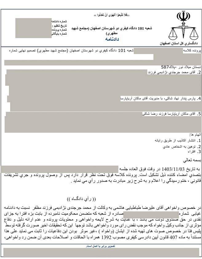آقای محمد جرجندی بابت دفاعیاتی که در اینجا مطرح شد، به جرم نشر اکاذیب و افترا از طریق وکیل خود علیه دکتر آریا پارسا شکایتی را ثبت نمود. دادگاه در تاریخ 4 مهر 1403 این شکایت را بررسی کرد ولی به دلیل این که هیچ مدرک و دلیلی وجود نداشت و شکایت فقط در حد ادعا بود، قرار منع تعقیب را صادر کرد. حکم رای صادره در ادامه آورده شده است:
