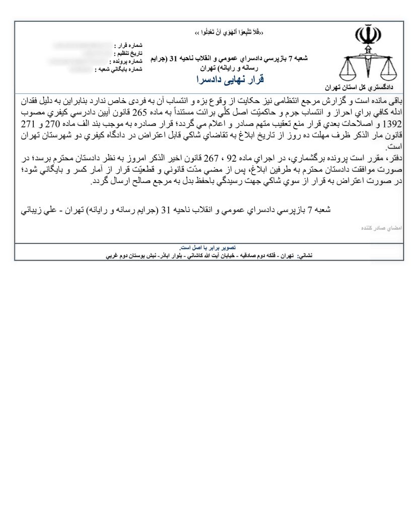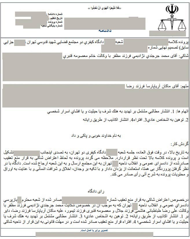 صدور رای قطعی دادسرا بابت شکایت محمد جرجندی