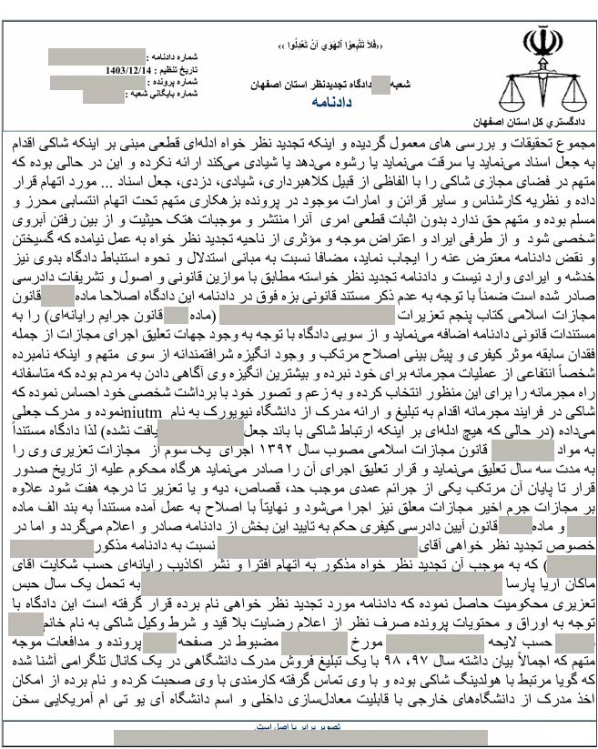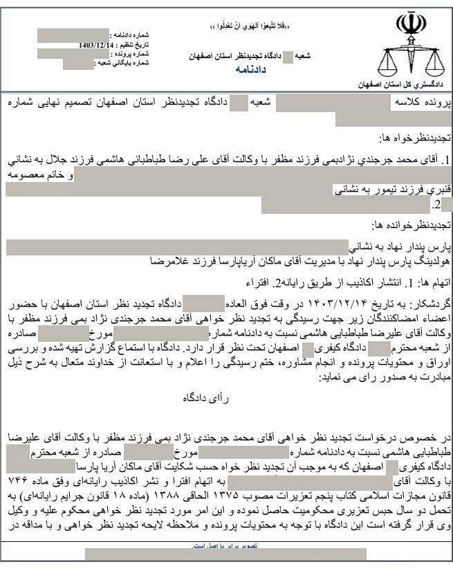 با توجه به درخواست تجدیدنظر آقای محمد جرجندی نسبت به حکم 2 سال حبس وی، جلسه ای در تاریخ 14 اسفند ماه 1403 در دادگاه تجدید نظر استان اصفهان تشکیل شد و با توجه به اینکه وی هیچ ادله قطعی راجع به افتراهای خود نسبت به دکتر آریا پارسا و گروه بین المللی پارس پندار نهاد ارائه نکرد، دادگاه تجدیدنظر، حکم قطعی 2 سال حبس را برای ایشان صادر نمود.