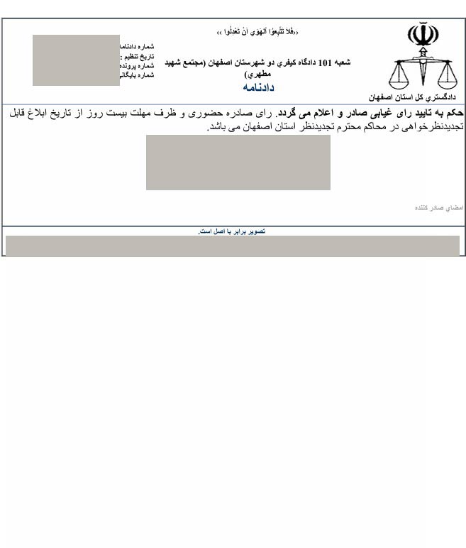 آقای جرجندی بابت اعتراض به حکم قبلی درخواست واخواهی به دادگاه داده بود که این درخواست در تاریخ 3 بهمن 1403 توسط دادگاه رد شد و حکم قبلی ایشان تایید و در تاریخ 7 بهمن 1403 ابلاغ شد. تصویر حکم صادره به شرح زیر است:
