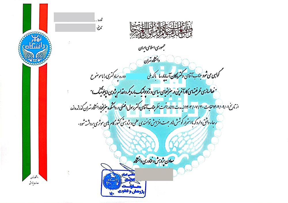 ایشان برای اثبات این ادعا با هک کردن وبسایت آن دانشگاه آمریکایی، لیست افرادی که در این سایت ثبت شدهاند را به عنوان فارغالتحصیل، استخراج و منتشر کرده و برای انتساب آن به آقای آریاپارسا به این سه مورد استناد کرده است: